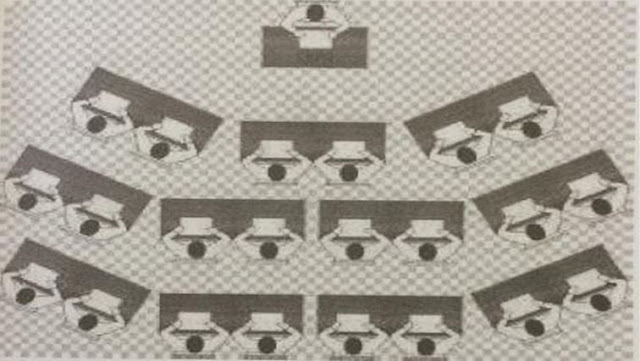 Namun, yang membedakan hanyalah, posisi tempat duduk bagian samping kanan serong ke kiri sedangkan bagian samping kiri serong ke kanan. Posisi bagian tengah tetap, sedangkan tempat duduk guru tepat di posisi tengah bagian depan.